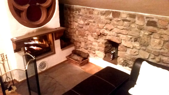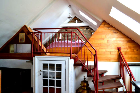 Im hinteren Teil des Obergeschosses befindet sich das Galeriezimmer mit Kamin, Klavier und einer Empore zum schlafen.