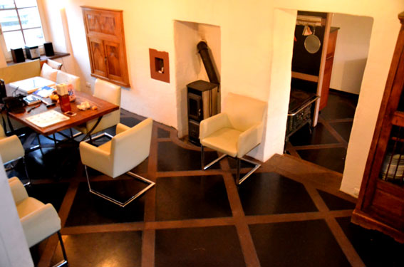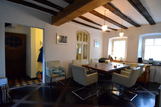 Der Wohnraum bietet Platz für 8 Personen am Tisch und hat neben der Zentralheizung auch einen effektiven Holzofen